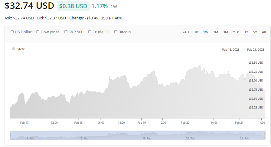 Spot silver was flat at $32.92 an ounce, and palladium dipped 0.3% to $974.75. Both metals were headed for weekly gains.