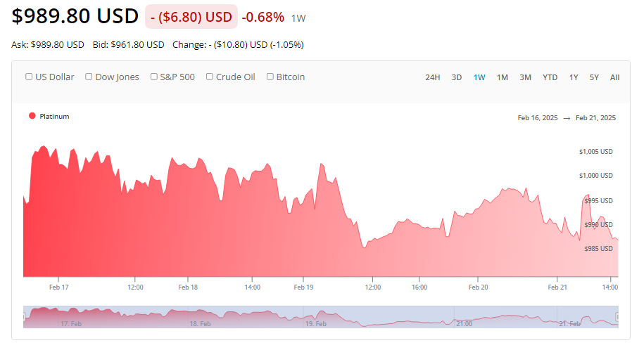 Platinum shed 0.2% to $976.80 and eyed a weekly decline.